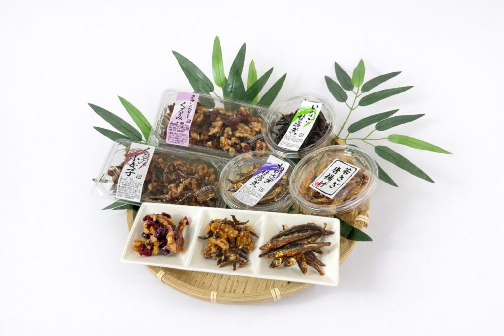 香ばしいクルミ小魚やワカサギ甘露煮など。甘じょっぱい味は、ご飯やお酒、栄養おやつに最適です。